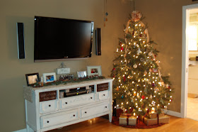 I am still in LOVE with my "entertainment center"! I bought it from a man off Craigslist back earlier in the year. He actually has a business where he buys furniture and refinishes it and then re-sells it. I bought a dresser from him for my bedroom a couple of weeks ago and I love it too. This one is an antique buffet that has been painted white & distressed to look shabby chic. Love that look! I took the 2 drawers out on the sides and put baskets in instead. Then instead of having a drawer in the middle, I use it for my cable box and DVD player. Love it!!